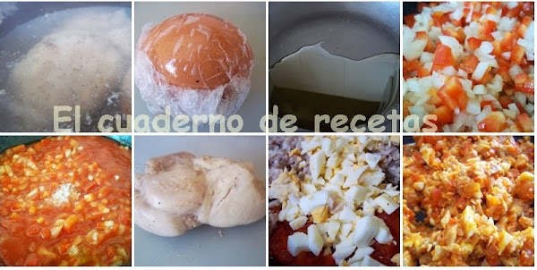 El pollo, una vez cocido lo cortamos en trozos pequeños, el huevo lo troceamos y cuando el sofrito está listo, lo mezclamos bien.