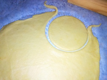 Una vez estirada, buscáis un molde para hacer las obleas redondas de las empanadillas. Yo cogí un bol del niño, podéis coger tazas o similares, según lo grandes que las queráis. Yo las quería grandes, como las que venden en las panaderías