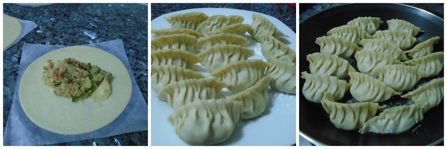 Calentamos el aceite en una sartén y añadimos las empanadillas, cuando la parte de abajo empiece a dorarse, añadimos agua fría cubriendo la mitad de las empanadillas, es el momento de poner la tapa y cocerlas al vapor hasta que se evapore el agua.
