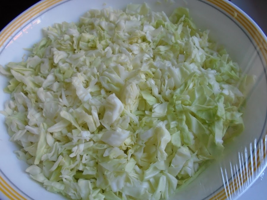 Lo primero que haremos es cortar la col en juliana en trozos muy picados. La colocamos en un bol y añadimos una pizca de sal, para que sude y quitarle el poquito de agua.
