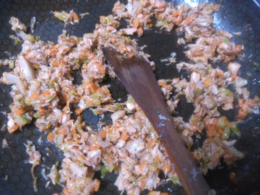 Primero hacemos el relleno puesto que para rellenar las empanadillas ha de estar frío. Picamos y sofreimos todas las verduras. Mezclamos con el pollo desmenuzado y reservamos.