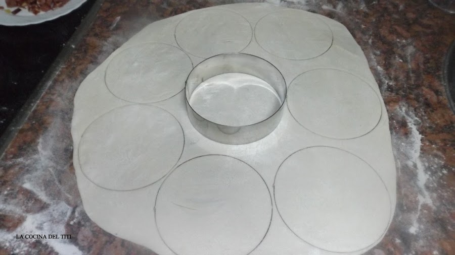 2º Estiramos la masa con la ayuda de un rodillo dejandola bien fina. Con la ayuda de un aro de cocina marcaremos 8 circulos que es mas o menos para lo que nos va dar con un aro de 10 cm de diametro
