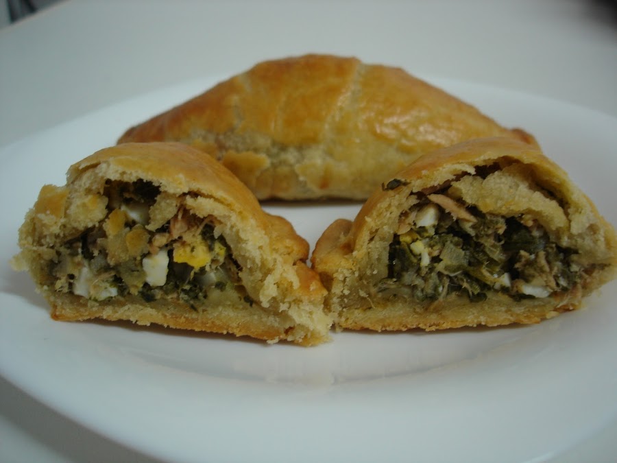 Hacer bolas con la masa, extenderla con la ayuda de una bolsa de plástico dándole una forma redonda, poner una parte del relleno, cerrar, pintar con huevo y hornear. Horno por abajo a 180 grados durante unos 40 minutos.