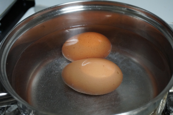 Lo primero pondremos el horno a 180ºC. calor arriba y abajo. Ponemos un cazo con agua, añadimos los huevos y dejamos cocer 10 minutos.