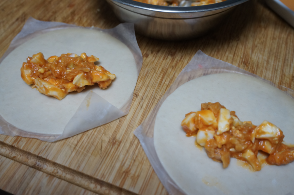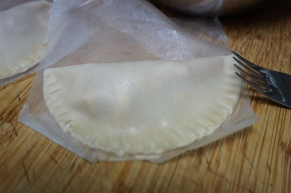 Preparamos las obleas en la encimera, vamos ponemos cucharadas de relleno, cerramos y con ayuda de un tenedor vamos sellando la masa.