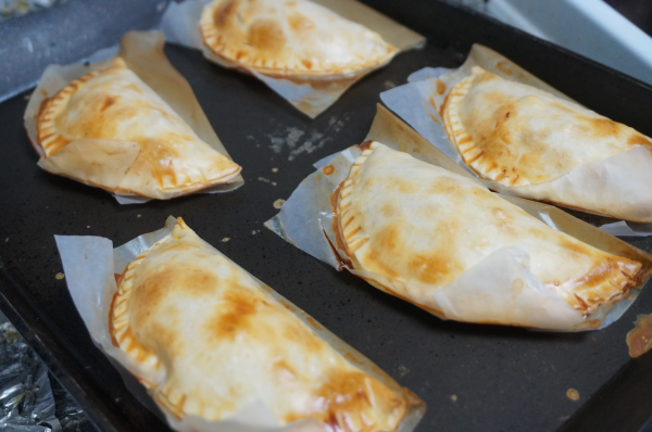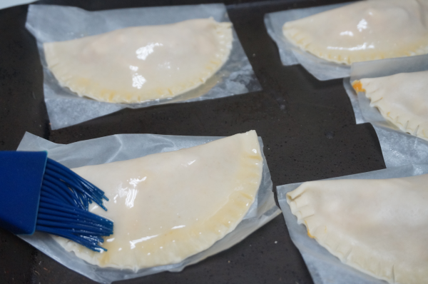 Ponemos las empanadillas en una fuente para horno, batimos el huevo y con una brocha pintamos las empanadillas.