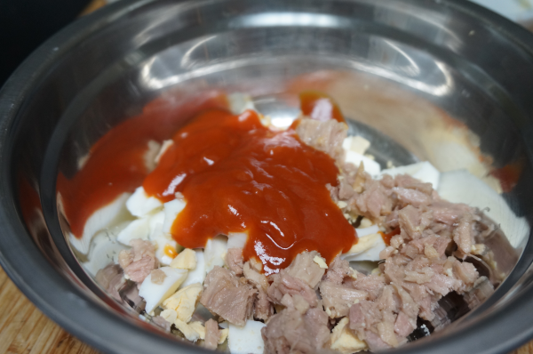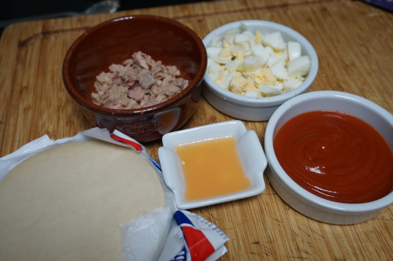 Cuando estén cocidos los huevos escurrimos y dejamos enfriar. En un bol ponemos las dos latas de atún escurrido y desmenuzado, pelamos los huevos y cortamos en trozos pequeños lo añadimos al atún y terminamos añadiendo el tomate frito, iremos poniendo tomate hasta formar una pasta y la dejaremos a nuestro gusto. Siempre es mejor hacer la masa jugosa, para que una vez hechas al horno no se queden secas por dentro.