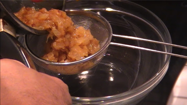 Prepara un bol con un colador y pon el él la cebolla dejando que todo el aceite sobrante caiga al bol. Lo aprovecharemos para hacer la masa de la empanada.