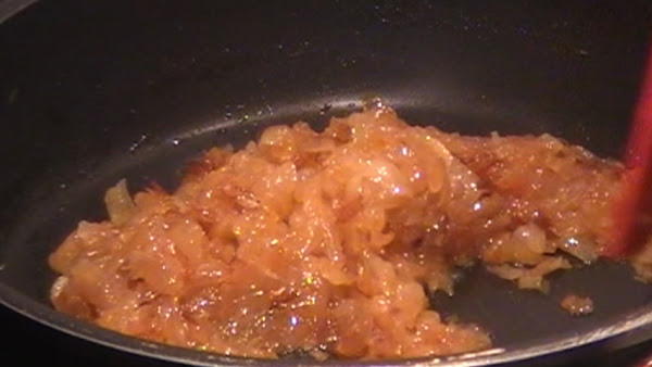 Prepara una sartén a fuego medio-alto y saltea la cebolla con un poquito de sal. A los 10-15 minutos estará dorada. Añade unas gotas de agua que ayudarán a desglasar el fondo de la sartén y hará que la cebolla quede caramelizada.