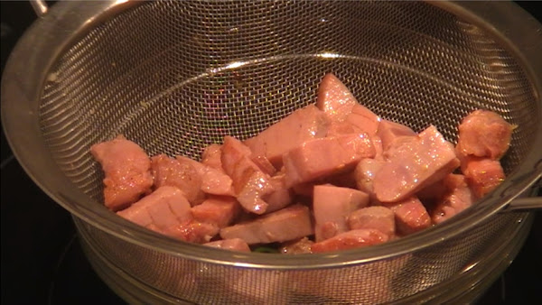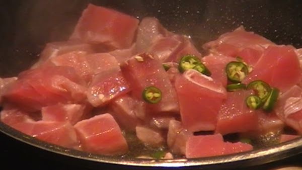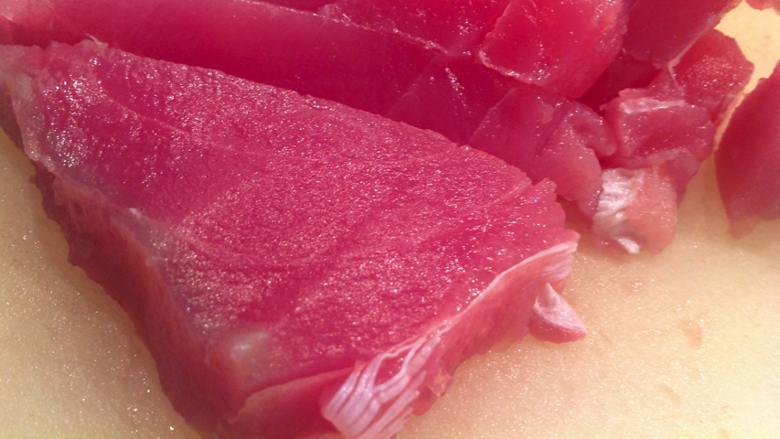 Corta el atún en trocitos.
