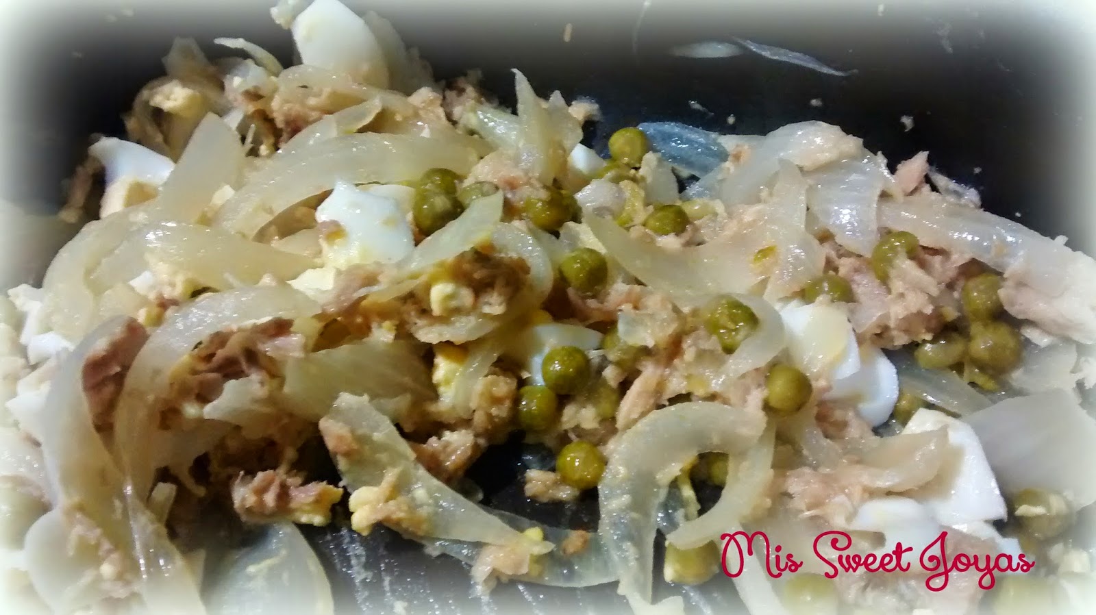 Una vez hecha, con el fuego apagado, le echamos los guisantes, el atún y los huevos troceados.