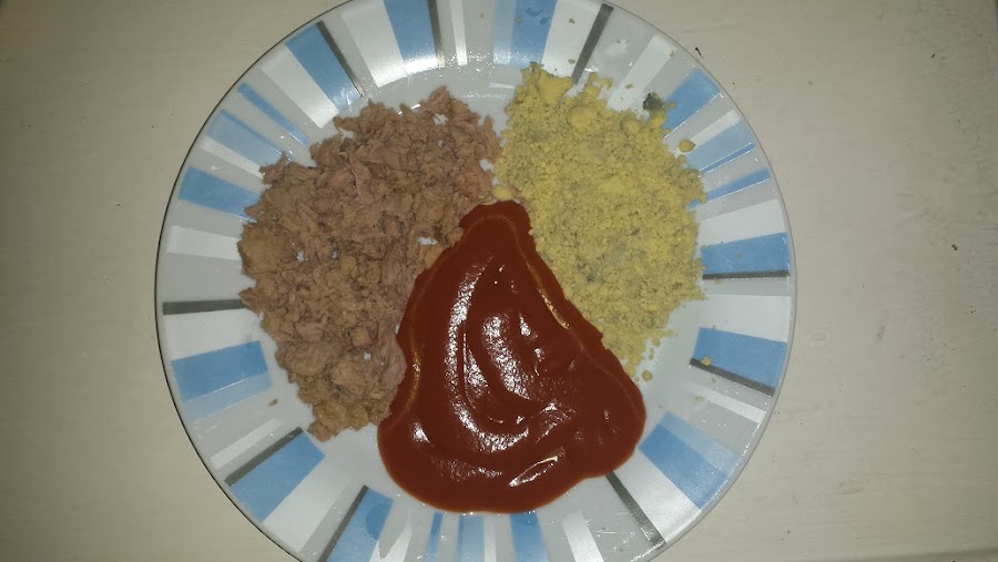 Los ponemos en un bol y añadimos el tomate frito y el atún o bonito bien escurrido.