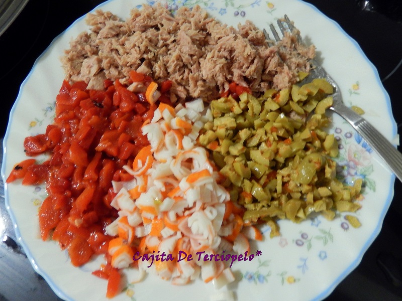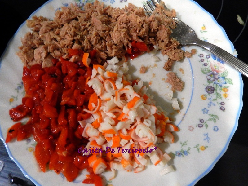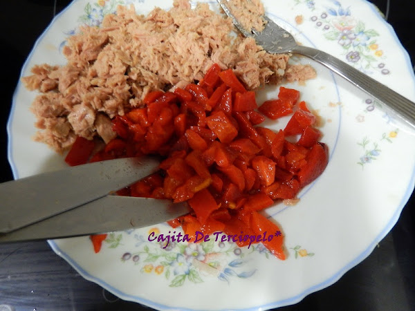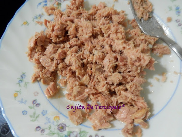 Mientras tanto iremos preparando el resto del relleno. En un plato desmenuzaremos las dos latas de atún.