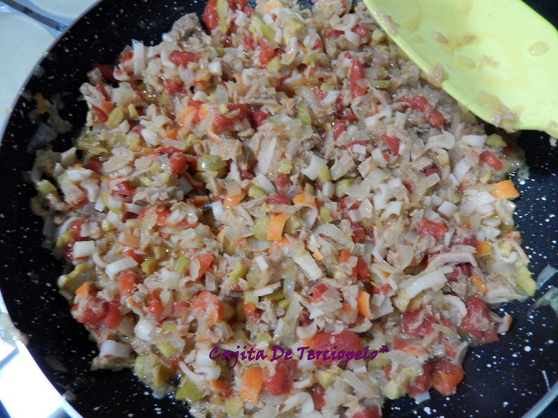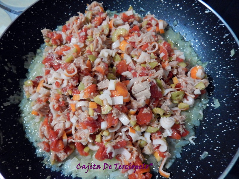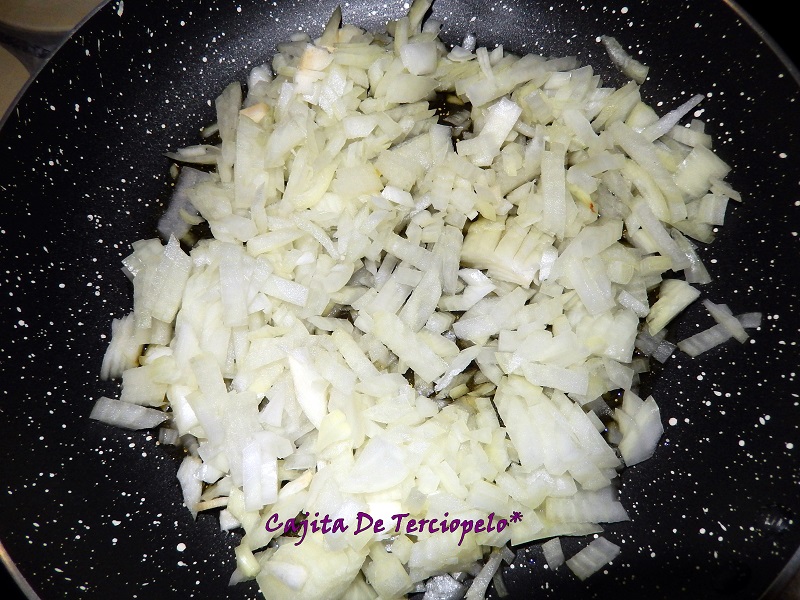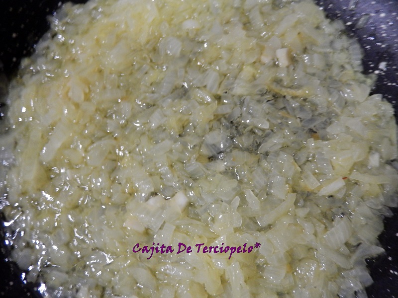 Mezclaremos todo esto muy bien, y lo agregaremos a la cebolla que ya estará pochada. Lo dejaremos a fuego lento e iremos dándole vueltas durante unos 5 minutos.