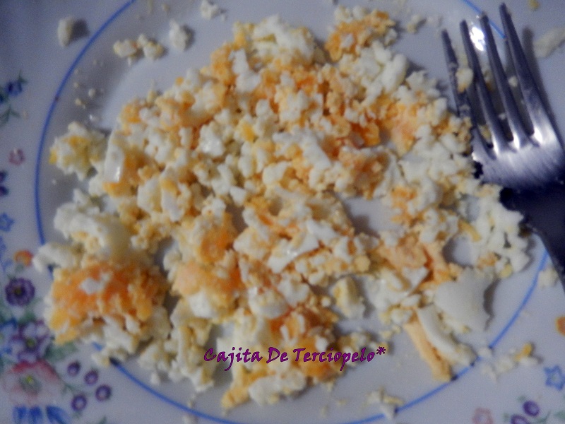 Pondremos a hervir el huevo durante 10 minutos, lo pelaremos y lo chafaremos con un tenedor (no lo rallaremos, sino, quedará una pasta).