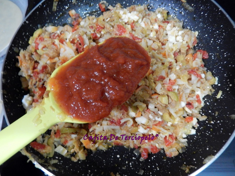 Lo agregaremos a la sartén y le daremos un par de vueltas con los demás ingredientes. No queremos que se nos deshaga el huevo y así la pasta quedará suelta. Le añadimos la cucharada de tomate frito, un par de vueltas mas y la pasta para el relleno ya está hecha.