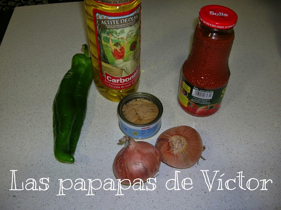 Poner a pochar el pimiento conjuntamente con la cebolla a la que estén apagar el fuego y añadir el atún desmigado e incorporar el tomate frito