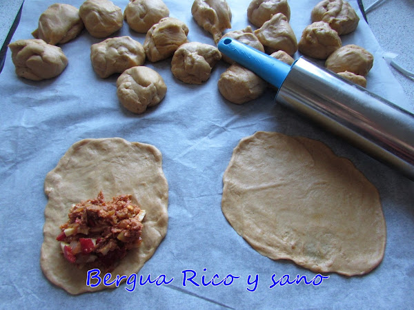 7. Rellenamos y cerramos la masa sobre el relleno. Con un tenedor sellamos los bordes.