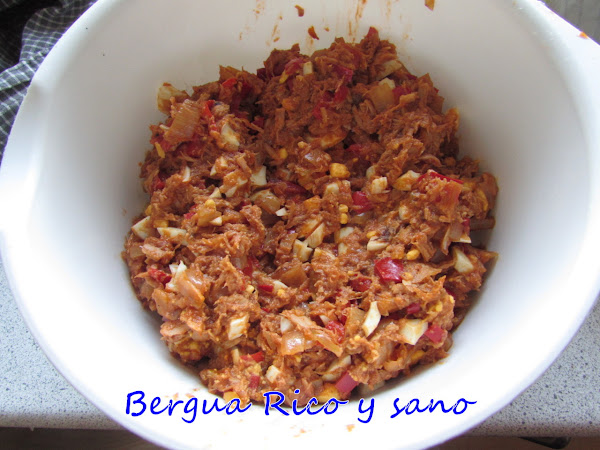 3. Entonces añadimos el atún desmenuzado, el ajo prensado, pimienta y el huevo duro picado, mezclamos y le damos 5 minutos más al fuego con tapa (salvo si hay exceso de líquido o no). Después pasamos la mezcla a otro recipiente y la dejamos enfriar.