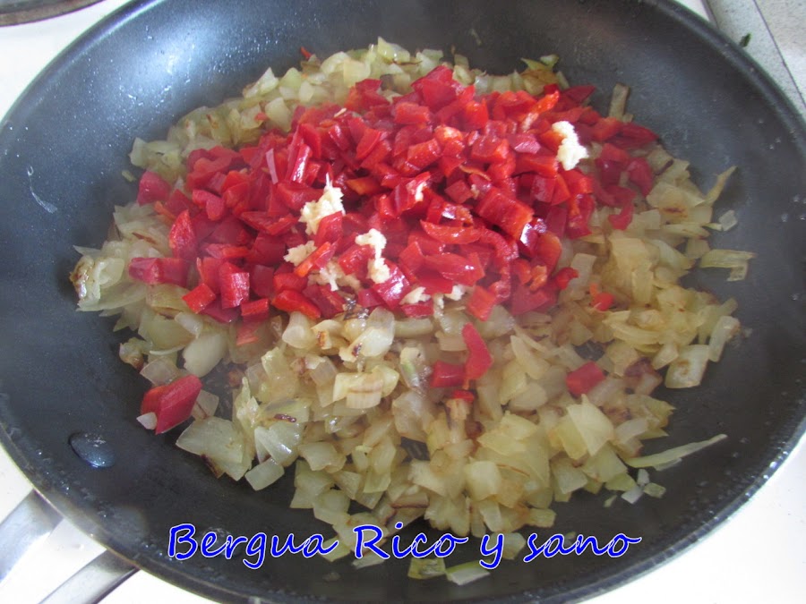2. Añadimos el pimiento picado y el tomate y le damos 20-30 minutos tapado y a fuego lento-medio.