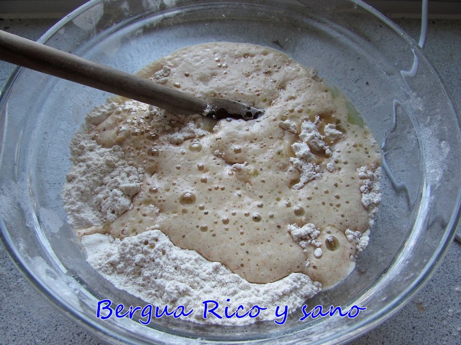 5. Mezclamos bien con una cuchara de madera y, si hace falta, espolvoreamos con un poco más de harina y vamos mezclando. Tiene que quedar una masa elástica y que no se nos pegue a la mano.