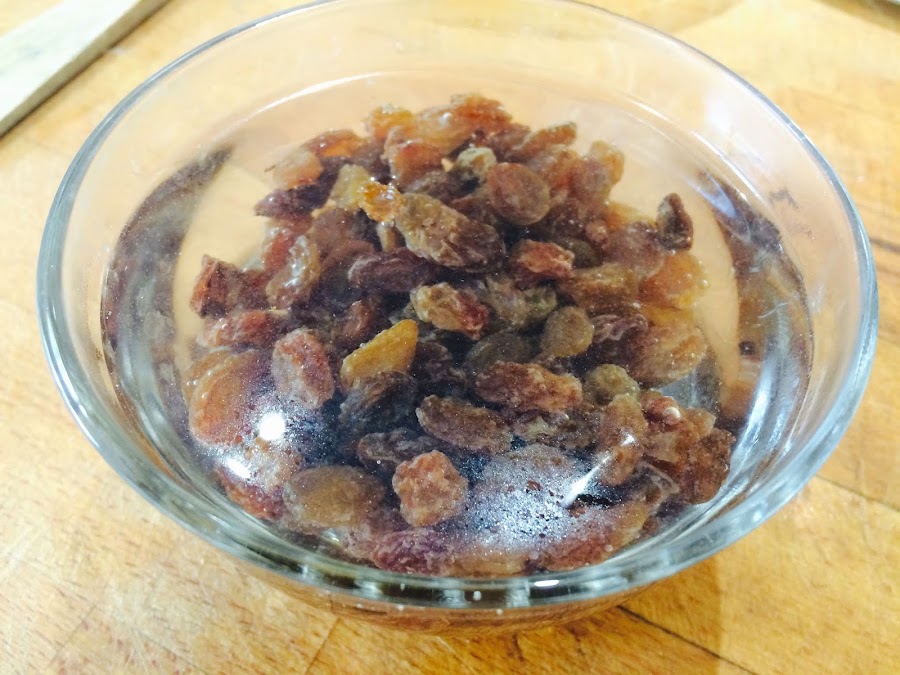 En un bol pequeño ponemos las pasas a hidratar, podemos emplear agua, moscatel o brandy, en mi caso he empleado agua dejamos alrededor de 1 hora.