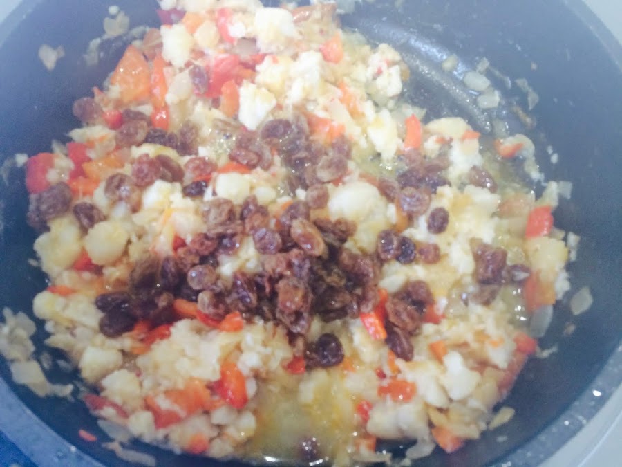 Incorporamos las uvas pasas y dejamos 10 minutos más con la misma potencia del fuego.