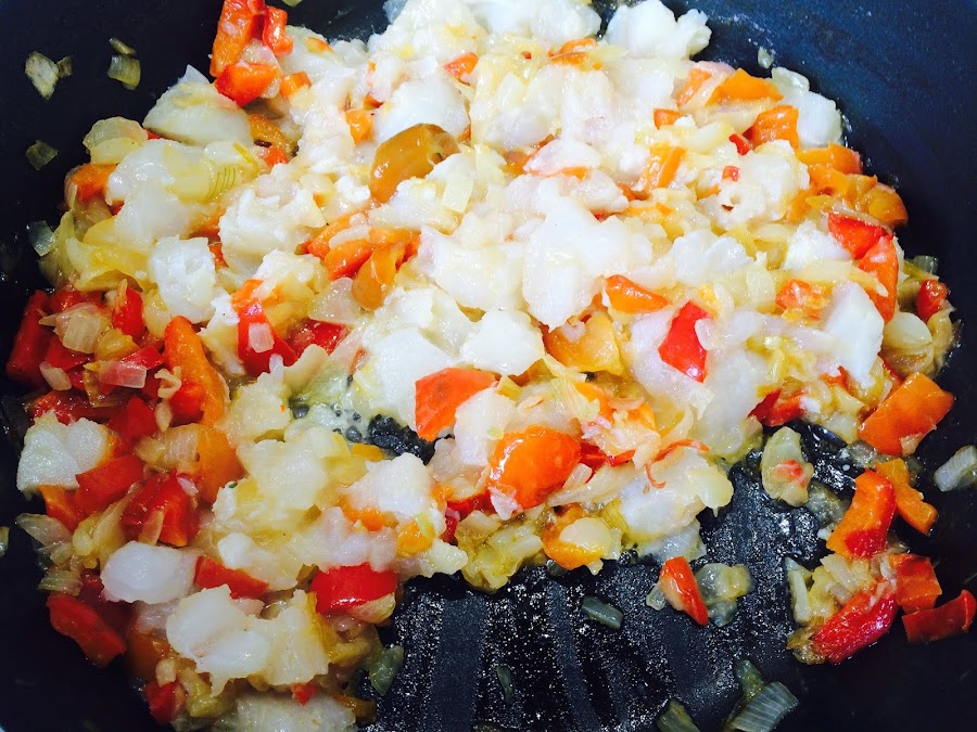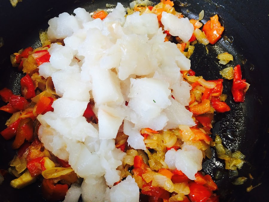 Después de 1 hora de mochado de las verduras a temperatura baja incorporamos en la sartén el pescado y removemos con una cuchara de madera.