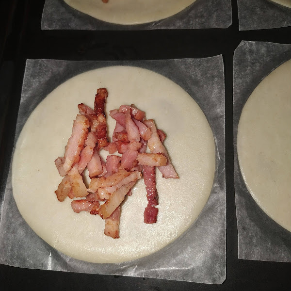 Colocamos la mitad de las obleas en la encimera y en el centro de cada una ponemos un montoncito de bacon y un montoncito de queso.
