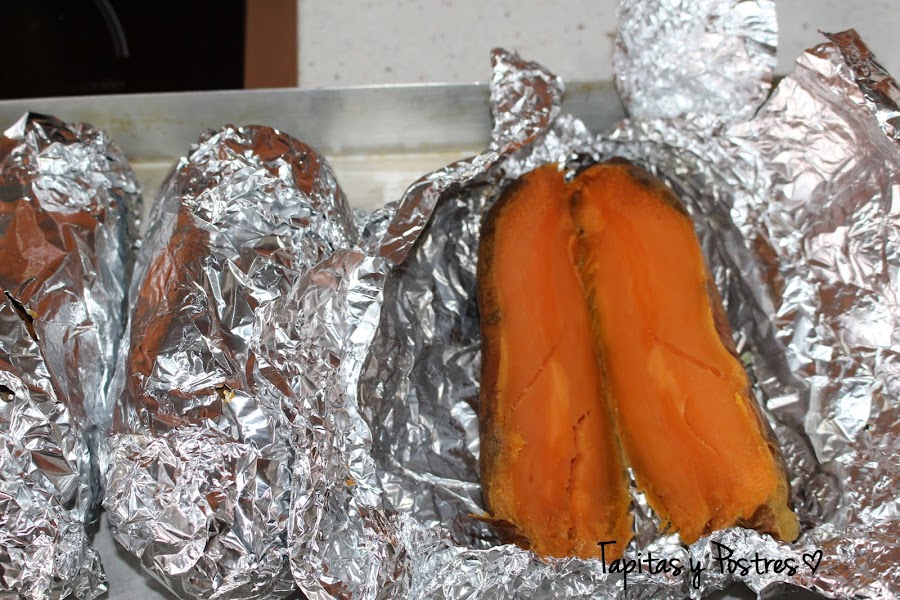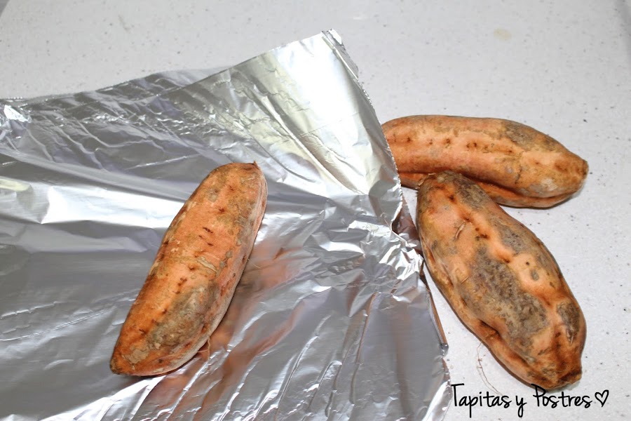 Lavamos muy bien las batatas, Las liamos en papel aluminio y las horneamos una hora mas o menos. Las dejamos liadas hasta que se enfríen.