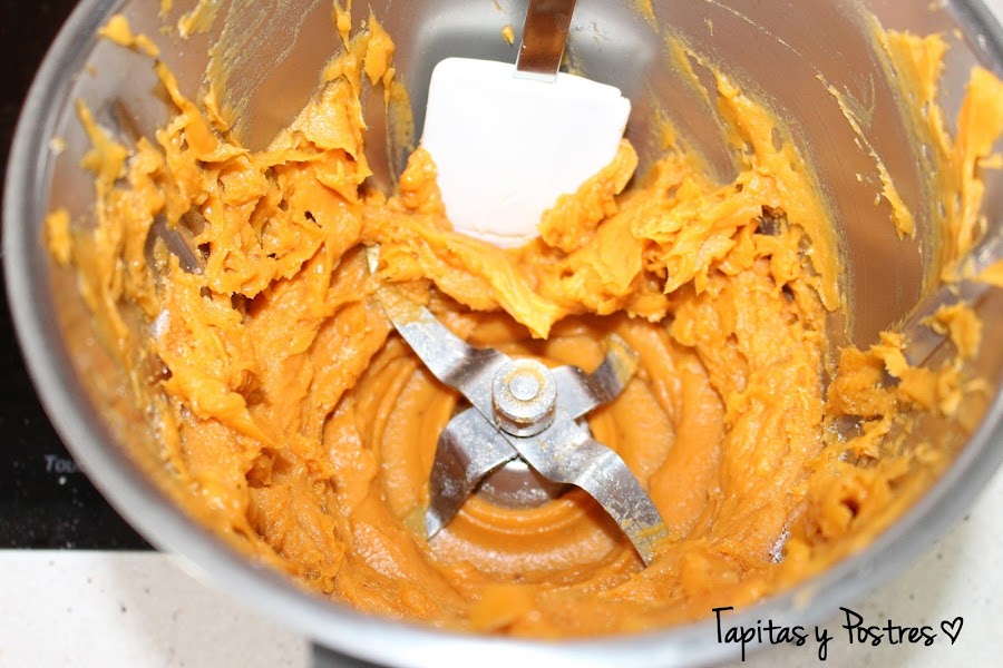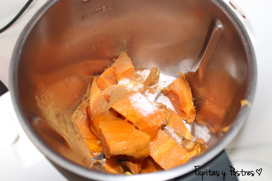 Primero asamos las batatas. Las lavamos muy bien y las secamos. Las envolvemos en papel aluminio y las asamos a 200º unos 60 minutos. Dejamos envueltas hasta que se enfríen. Una vez frías, le quitamos la piel y las ponemos en el vaso de la thermomix o de una batidora con el azúcar, la miel y la canela. Lo trituramos hasta obtener un puré espeso. Reservamos.
