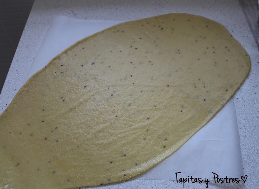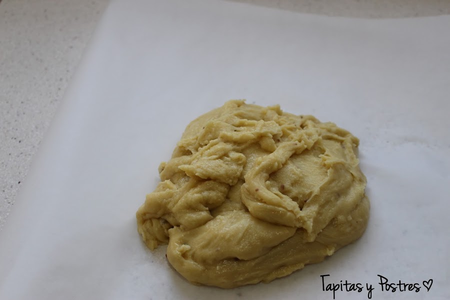 Sacamos la masa a la encimera. Ponedla sobre un papel vegetal. Es una masa muy aceitosa pero fácil de trabajar.