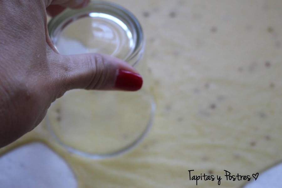 Sacamos la masa del vaso, la estiramos con un rodillo hasta dejarla fina, Si notáis que la masa se encoge, la dejamos reposar unos cinco minutos. Con un cortapasta o un vaso, cortamos círculos y le ponemos una cucharadita de relleno en medio. Doblamos por la mitad y cerramos con un tenedor haciendo muescas por todos los filos.