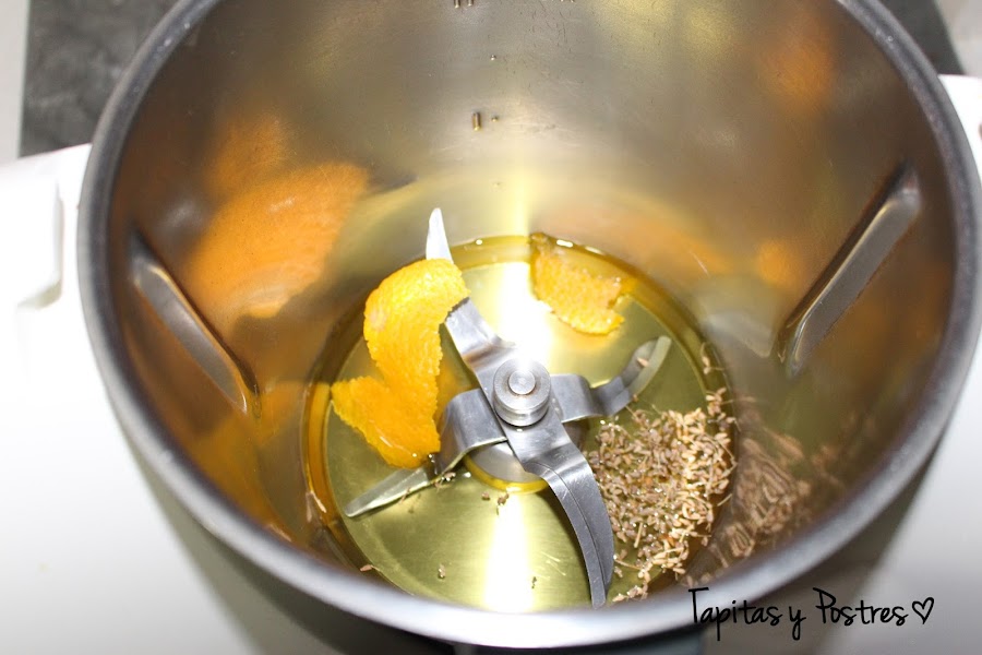 Vamos con la masa. Calentamos el aceite con la cascara de naranja y la matalahuga.