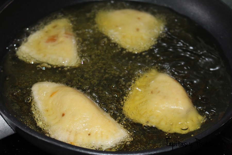 Calentamos abundante aceite en una sartén pequeña pero honda, para que cubra por completo las empanadillas y las vamos friendo en tandas de tres o cuatro. Cuando las veamos doradas por los dos lados, sacamos y dejamos escurrir sobre papel absorbente. Al enfriarse las espolvoreamos con azúcar glass vertida sobre un colador.