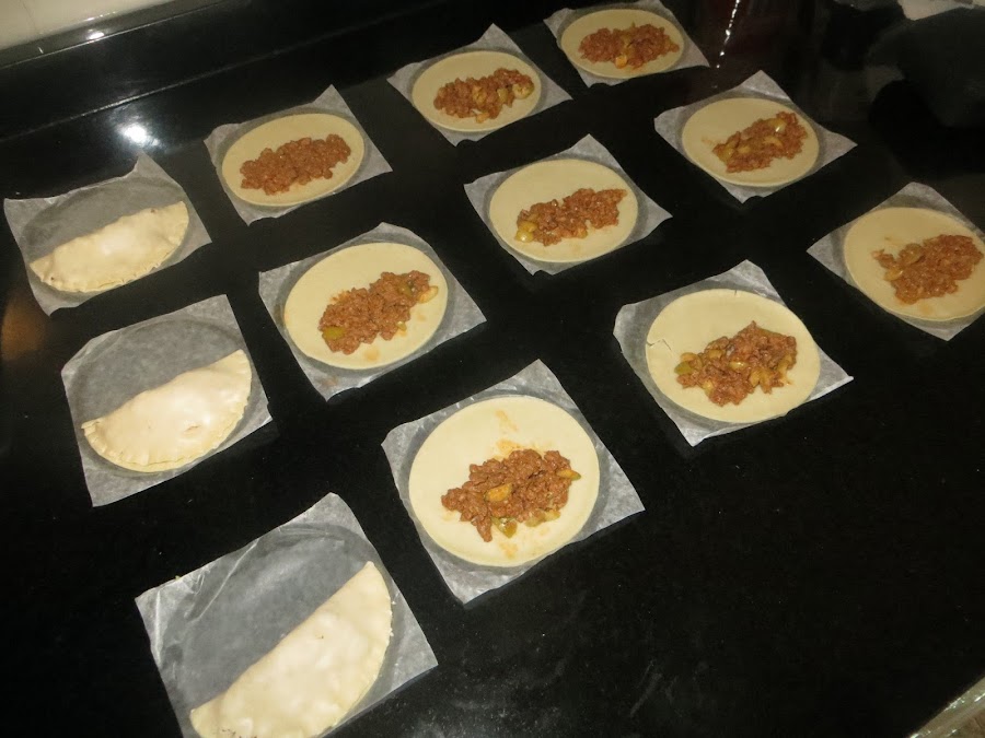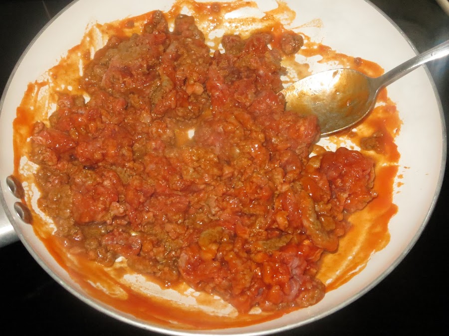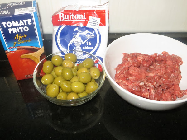 Freír la carne picada con las aceitunas troceadas y la salsa de tomate. Una vez que la carne está cocinada, la dejamos enfriar.