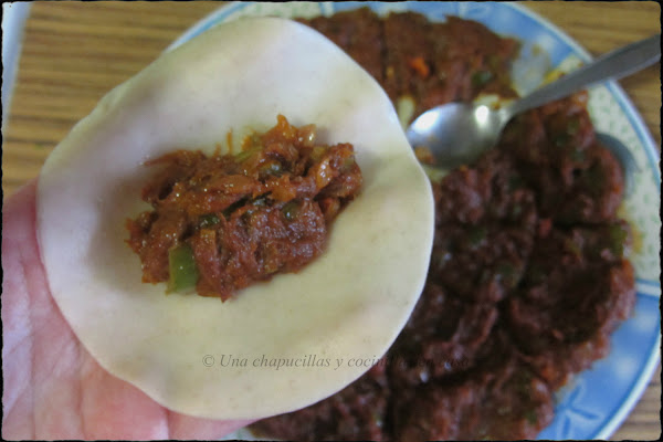 Con ayuda de una cucharilla ir poniendo el relleno, no os paséis y dejar hueco en los bordes para poder cerrar bien con ayuda de un tenedor.