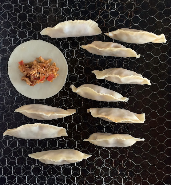 Retiramos la sartén del fuego, añadimos el huevo duro picado y dejamos enfriar totalmente el relleno (para que la masa no se ablande) Ponemos una cucharada del relleno en el centro de cada oblea, apretamos los bordes bien (para sellarlo y no se salga el relleno) o también se puede hacer un repliegue como un repulgue. Yo he utilizado un molde que tengo para sellar las empanadillas que me va genial y es muy rápido (vienen 3 medidas)