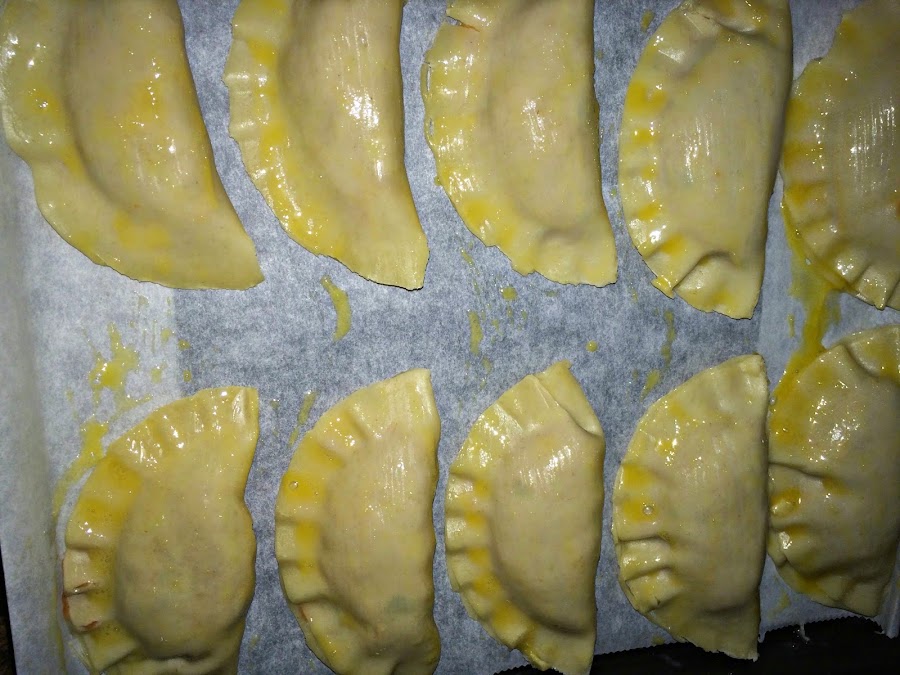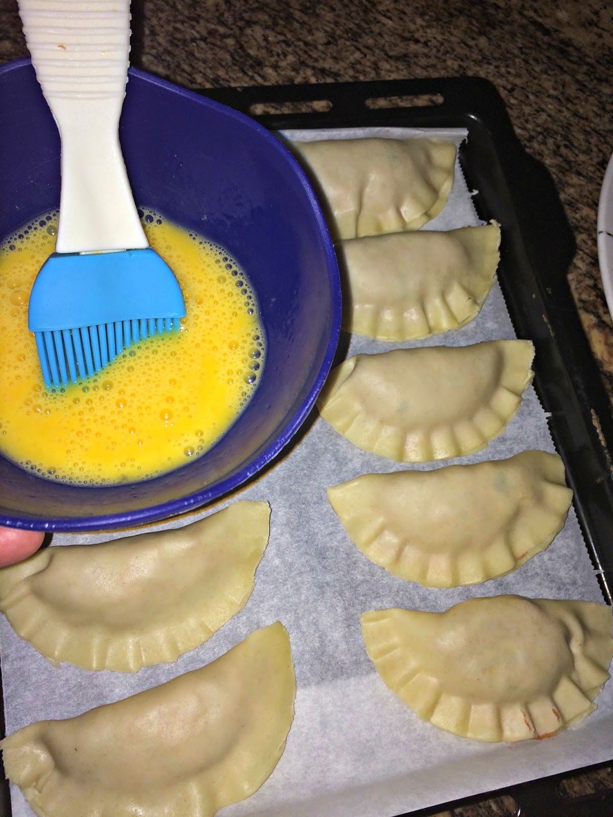 Una vez tengamos las empanadillas preparadas la vamos poniendo en la bandeja del horno, y las pintamos con huevo batido.