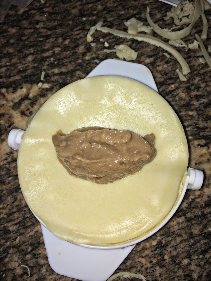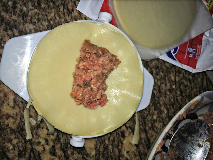 Una vez tengamos la carne picada preparada, empezaremos a rellenar las empanadillas, bien con el "aparato" o con las manos. Cogemos una oblea y ponemos una cucharadita de carne en el medio y con cuidado la doblamos por la mitad. Lo bueno del aparato es que la cierra con los bordes dentados, si no, lo hacemos con un tenedor apretando los extremos.