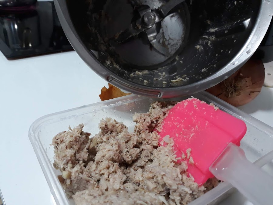 3.- Ponemos la carne en el vaso de la thermomix y la trituramos de 5 a 10 segundos, velocidad 5. Como ya está cocida, no hay que triturarla mucho, para que no se quede una pasta. Reservamos.
