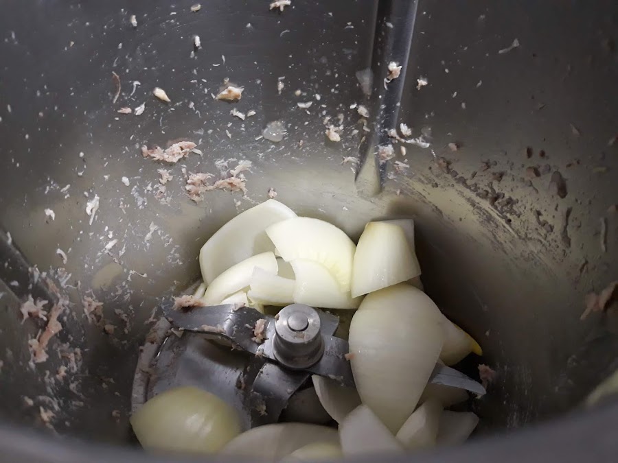 4.- Pelamos la cebolla y la ponemos a cuartos en el vaso de la thermomix y picamos 5 segundos, velocidad 5.