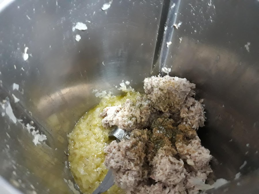 7.- Terminado el tiempo de la cebolla, añadimos la carne, el huevo y las especias y mezclamos 5 segundos velocidad 1.