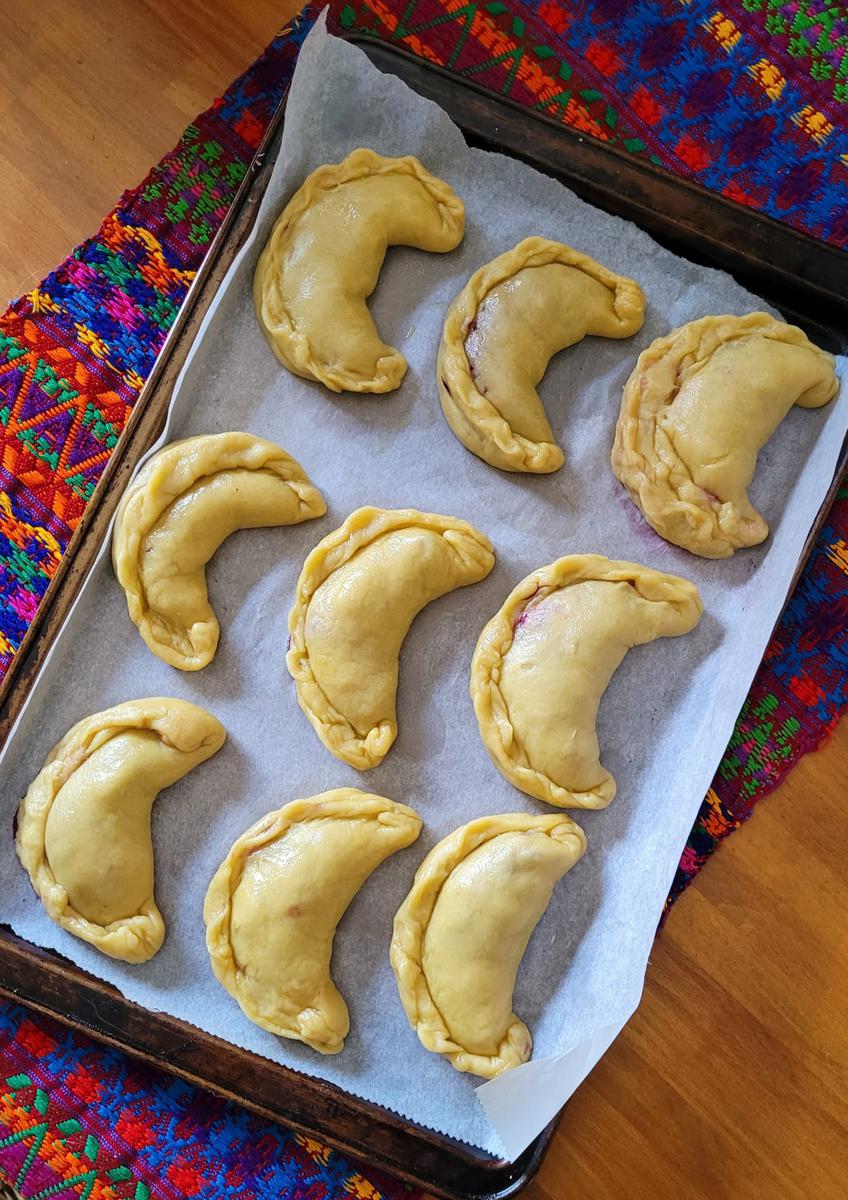 Una vez que hayas rellenado todas las empanadillas, con la ayuda de un pincel, pinta con el huevo batido. Mete la bandeja en la nevera por una media hora.