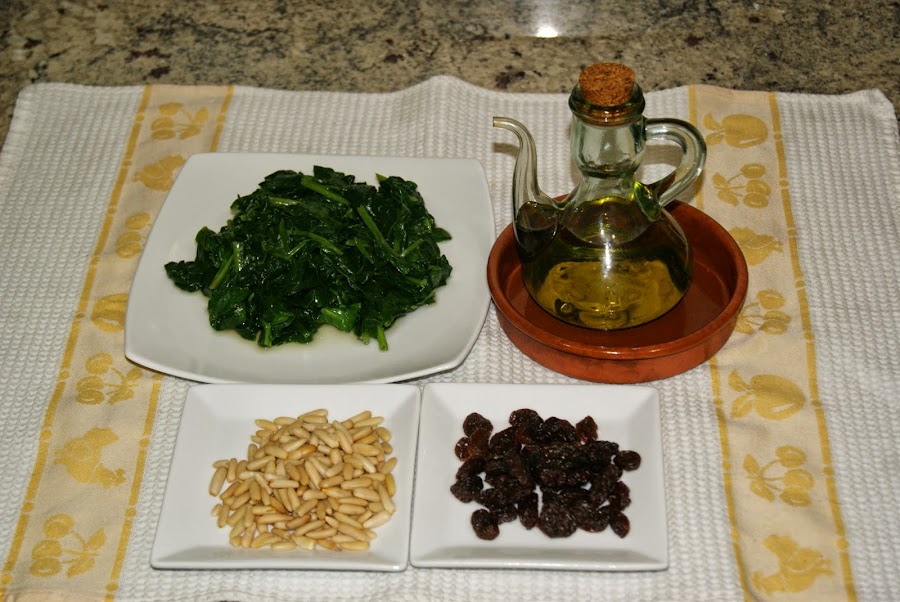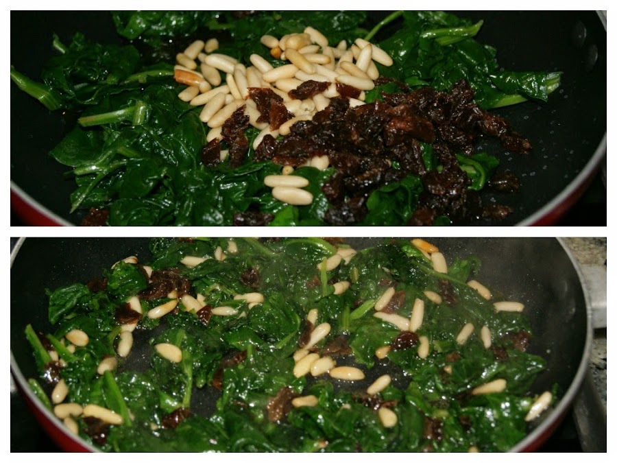 En una sartén con un poco de aceite salteamos las espinacas con las pasas, los piñones y la sal. He cortado las pasas pequeñitas.