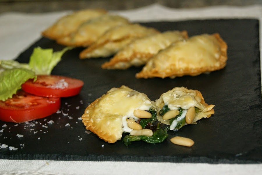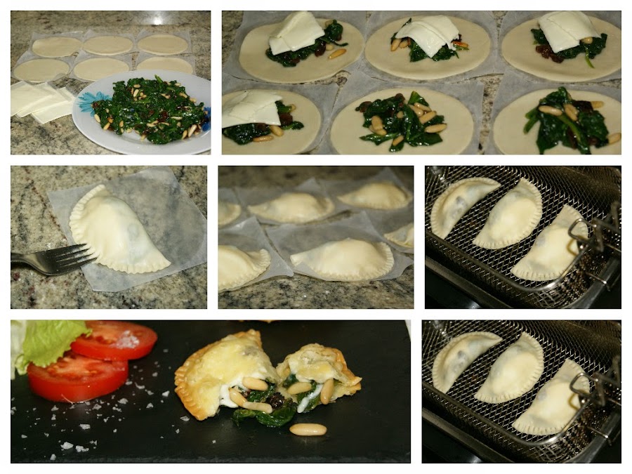 El relleno elegido es una combinación clásica como son las espinacas con las pasas y los piñones. He añadido un poco de queso fundido para hacerlas más jugosas, pero como no tienen salsas, aunque se abran un poco, no se se nos vacían ni dejan el aceite inservible. Espero que os gusten y que vuestras familias disfruten comiendo verduritas.