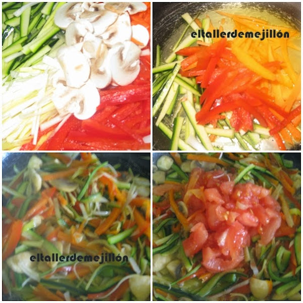 Lavamos y cortamos las verduras en juliana muy fina. Ponemos los 30 ml de aceite de oliva en una sartén, cuando esté bien caliente añadimos el calabacín, la zanahoria y el pimiento rojo. Vamos rehogando y añadimos el puerro y los champiñones.