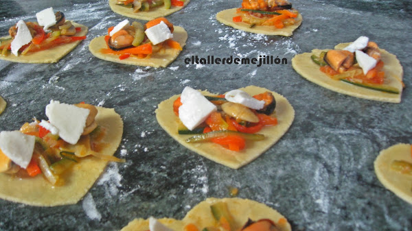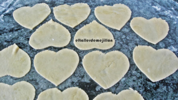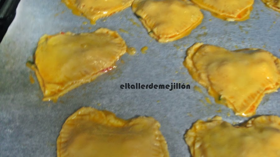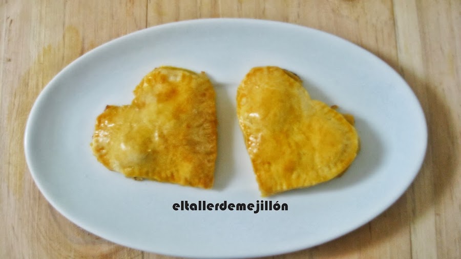Estiramos la masa y la cortamos con un molde, en este caso unos corazones , rellenamos con el preparado y disponemos dos trozos de mozzarella por empanadilla.