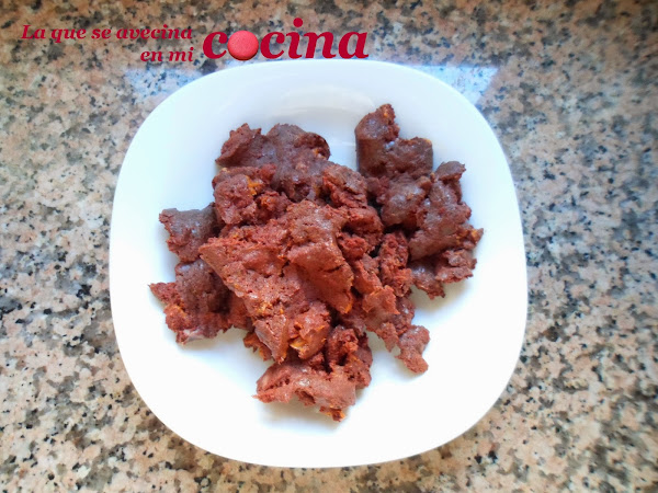 Mientras que la cebolla se está pochando, le quitaremos el pellejillo a la morcilla y sacaremos la carne. En un plato nos pondremos a machacarla con un tenedor para dejarla echa como una pasta.