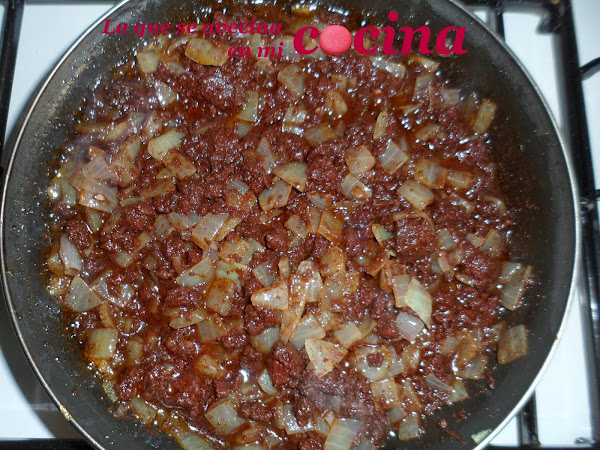 Añadimos la morcilla machacada a la sartén.